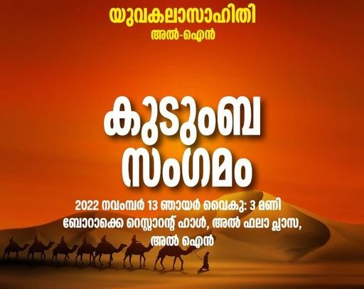 യുവകലാസാഹിതി വാർഷിക സംഗമം നവംബർ 20 ഞായറാഴ്ച ഇന്ത്യൻ സോഷ്യൽ സെന്റർ അജ്മാനിൽ വെച്ച് നടക്കും. വാർഷിക സംഗമം ജനയുഗം എഡിറ്ററും മുൻ എം.എൽ.എയുമായ ശ്രീ : രാജാജി മാത്യു തോമസ് ഉദ്ഘാടനം ചെയ്യും. തുടർന്ന് പ്രതിനിധി സമ്മേളനം, ആദ്യകാല പ്രവർത്തകരെ ആദരിക്കൽ, സാംസ്കാരിക സംഗമം എന്നിവ നടക്കും. എല്ലാവരേയും സ്വാഗതം ചെയ്യുന്നു.