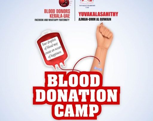 യുവകലാസാഹിതി അജ്മാൻ -ഉം അൽ ഖുവൈൻ യൂണിറ്റ് ബ്ലഡ് ഡോണെർസ് കേരള-യുഎ ഇ യുമായി സഹകരിച്ചു കൊണ്ട് നടത്തുന്ന രക്തദാനക്യാമ്പ് 2022 നവംബർ 14 ( തിങ്കൾ ) വൈകുന്നേരം 4 മണി മുതൽ രാത്രി 9 മണി വരെ അജ്മാൻ ലുലു ഹൈപ്പെർമാർക്കറ്റ് പരിസരത്തിവെച്ച് നടത്തപ്പെടുന്നു.