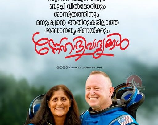 സുനിതാ വില്യംസിന് ,ബുച്ച് വിൽമോറിന് , നിക്ക് ഹേഗിന്, അലക്സാണ്ടർ ഗോർബുനോവിന് ശാസ്ത്രത്തിന്, മനുഷ്യൻ്റെ സീമകളില്ലാത്ത ജ്ഞാനതൃഷ്ണയ്ക്ക് മുന്നിൽ ആദരവോടെ യുവകലാസാഹിതി യുഎഇ അഭിവാദ്യമാല്യമായി വയലാറിൻ്റെ ഈ കവിതാശകലം സമർപ്പിക്കുന്നു