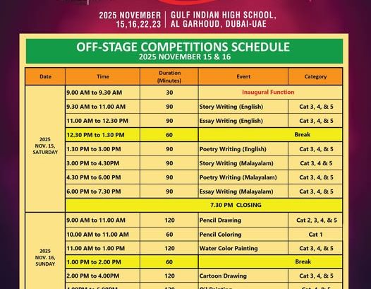 22,23 തീയതികളിൽ ദുബായ് ഗൾഫ് ഇന്ത്യൻ ഹൈസ്കൂളിൽ നടന്ന സ്റ്റേജ് മത്സരങ്ങൾ കാണികളിൽ ആവേശമുണർത്തി. കുട്ടികളുടെ കലാപ്രകടനങ്ങൾ തന്നെ അത്ഭുതപ്പെടുത്തിയെന്ന് മുൻ കേരള സംസ്ഥാന കലാപ്രതിഭ കൂടിയായ വിനീത്കുമാർ അഭിപ്രായപ്പെട്ടു. പ്രവാസികളായ കുട്ടികളുടെ കലാപരവും സാഹിത്യപരവുമായ കഴിവുകൾ പ്രദർശിപ്പിക്കുവാൻ സംസ്ഥാന ഗവൺമെന്റിന്റെതന്നെ ഒരു സംവിധാനം ഏർപ്പെടുത്തുന്നതിനെക്കുറിച്ച് മുഖ്യമന്ത്രിയുമായി സംസാരിക്കുമെന്ന് മുഹമ്മദ് മൊഹ്സിൻ എംഎൽഎ ഉറപ്പ് നല്കി.