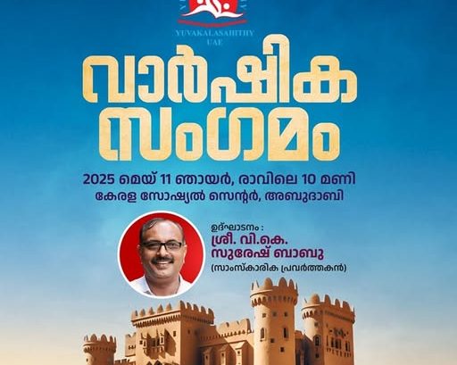 യുവകലാസാഹിതി യുഎഇ വാർഷിക സംഗമം മെയ് 11 ഞായർ രാവിലെ 10 മണി മുതൽ കേരള സോഷ്യൽ സെൻ്റർ അബുദാബിയിൽ വെച്ച് നടക്കുന്നു. വാർഷിക സംഗമം പ്രമുഖ വാഗ്മിയും സാംസ്കാരിക പ്രവർത്തകനുമായ വി.കെ. സുരേഷ് ബാബു ഉദ്ഘാടനം ചെയ്യും.